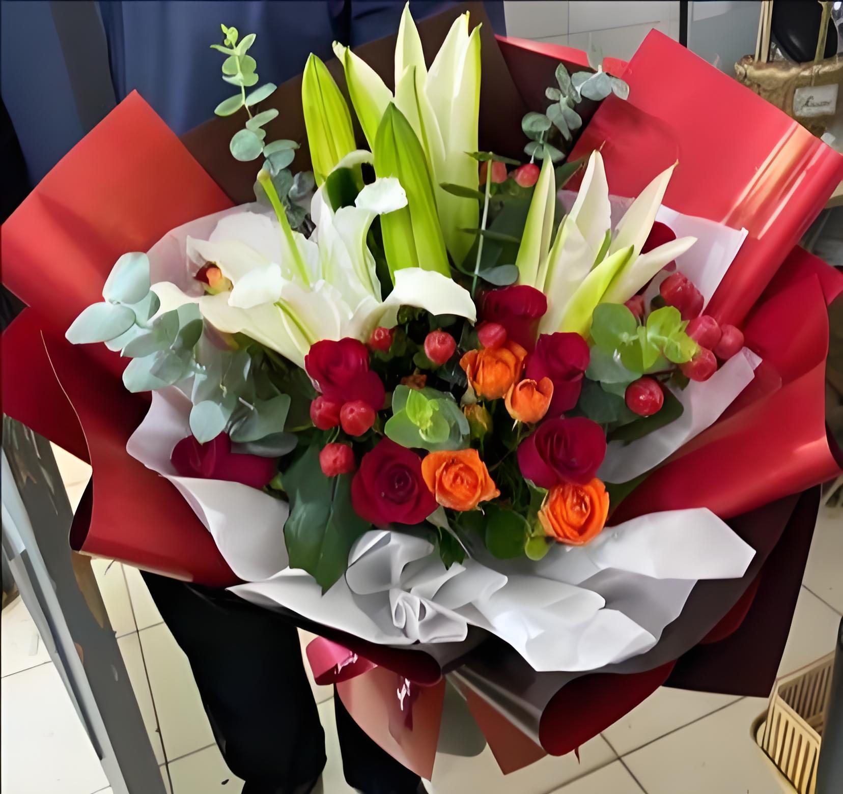 赣州宁都县花店包11枝红玫瑰、2枝多头白百合、6枝橙色多头玫瑰、红豆、尤加利叶